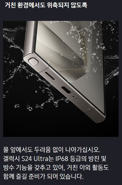 갤럭시 S24 울트라는 티타늄 프레임과 코닝 고릴라 아머가 적용되어 외부 충격에 강한 내구성을 자랑합니다. 또한, IP68 등급의 방수/방진 기능을 갖추고 있어 다양한 환경에서도 안심하고 사용할 수 있습니다.