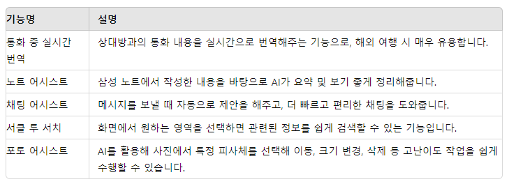 갤럭시 S24 울트라는 다양한 AI 기능을 제공합니다. 대표적인 AI 기능으로는 다음과 같습니다