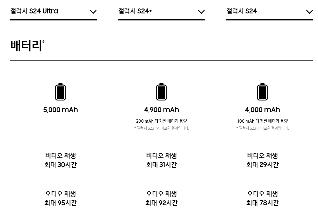 - 갤럭시 S24 울트라: 5,000mAh 배터리로 가장 큰 용량을 자랑해요. 그리고 고속 충전 기능도 더 강력해서 빠르게 충전할 수 있어요.